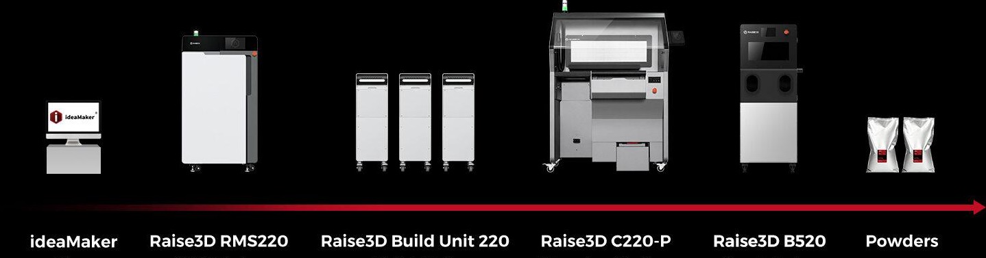 La Raise3D RMS220 s’appuie sur un workflow complet et optimisé pour maximiser la productivité en impression 3D SLS. De la préparation rapide des fichiers avec ideaMaker à l’optimisation de l’imbrication des pièces, chaque étape vise à réduire les coûts et le temps d’impression. Le préchauffage intelligent et l’impression haute vitesse grâce au laser 75W permettent une production rapide, tandis que le refroidissement externe de la Build Unit 220 assure une continuité de fabrication sans immobiliser la machine. Enfin, le post-traitement semi-automatisé avec la C220-P améliore l’efficacité opérationnelle, permettant de traiter de grands volumes de pièces avec un minimum d’intervention humaine.