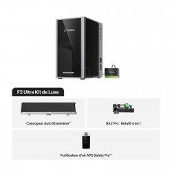 Machine portable de découpe et gravure laser - xTool F2 Ultra - Version Deluxe Bundle : Puissance Fibre 60W / Diode 40 W Surface : 220 x 220 mm Comprend : - 1x Machine F2 Ultra - 1x Plateau à lattes - 1x Lot de câble (Alimentation + Données) - 1x Lot d'accessoires et matériaux d'essai - 1x Guide de démarrage et consignes de sécurité - 1x Convoyeur AutoStreamline - 1x Dispositif Rotatif RA2 Pro -1x Purificateur d'Air SafetyPro AP2