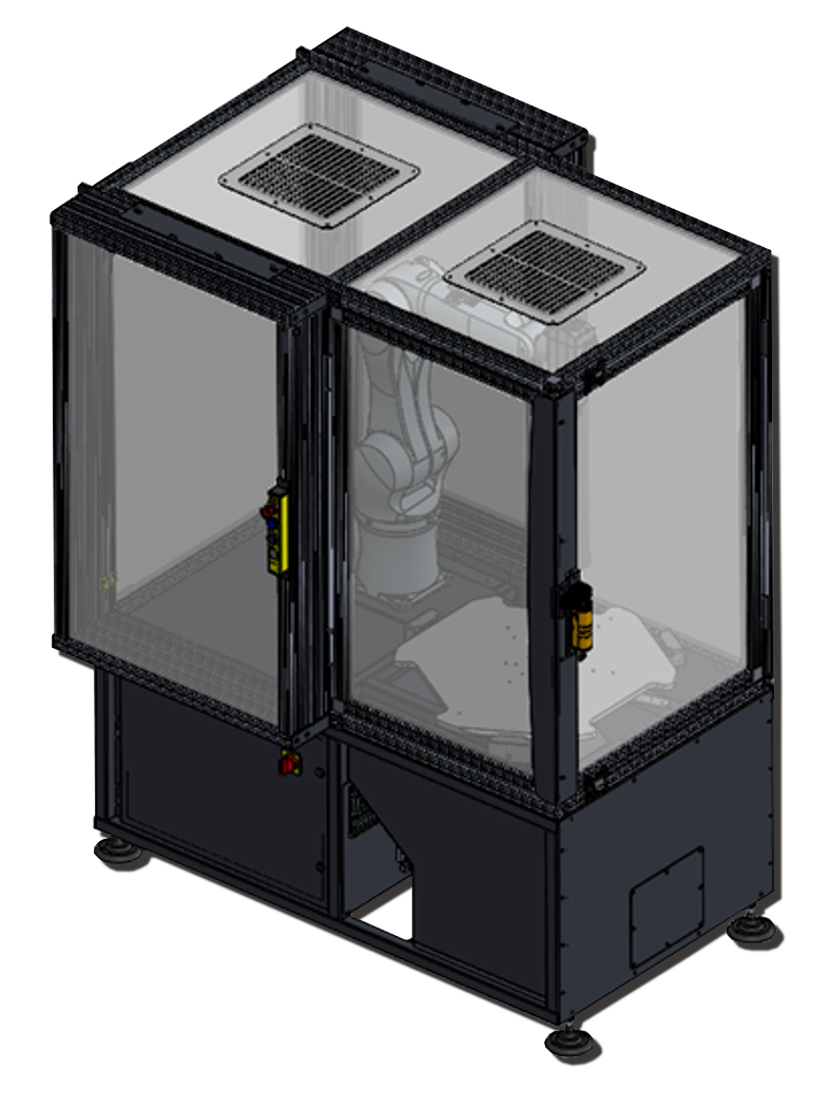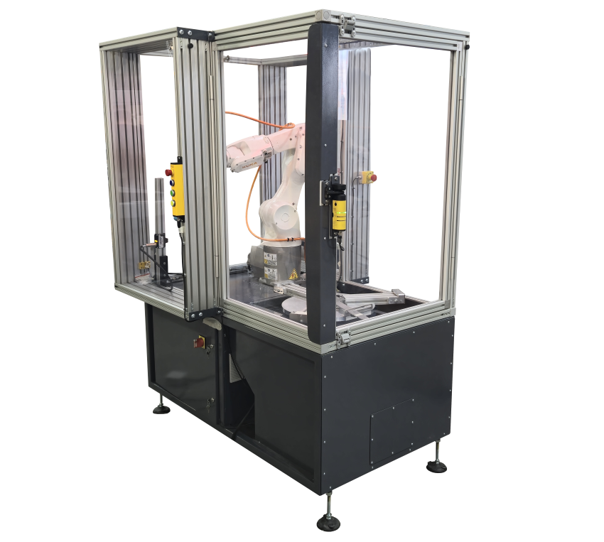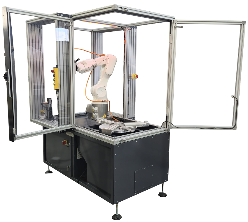 Dispositif de sécurité cellule, Châssis robot monobloc et cartérisation intégrale passant par une porte de 900mm, Table d'usinage rotative amovible compatible avec système de fixation invisible du bloc et changement rapide du plateau.